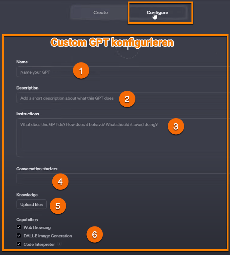 - Feinabstimmung des GPT: Man kann spezifizieren, welche Art von Instruktionen das GPT fokussieren soll, wie es diese präsentieren soll und was es vermeiden sollte zu erwähnen oder zu tun. Dies hilft, das GPT auf die Bedürfnisse deiner Zielgruppe zuzuschneiden.