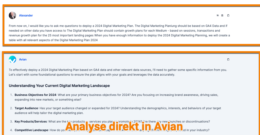 Ich habe jetzt AvianGPT umfangreich getestet, sowohl in ChatGPT also auch direkt unter Avian. Eine Datenanalyse hat natürlich immer sehr viele verschiedene Möglichkeiten und interessante Ansätze. Ein paar interessante Anwendungen möchte ich unbedingt mit dir teilen. Ich würde dir empfehlen, möglichst in Englisch zu prompten und gleichzeitig auch klar die Properties zu benennen. Also nicht :“Wie haben sich unsere Nutzer in GA4 entwickelt?“, sondern sehr konkret: „Wie haben sich Nutzer in GA4 für die Property [Name deiner Property] innerhalb der letzten 12 Monate entwickelt?“