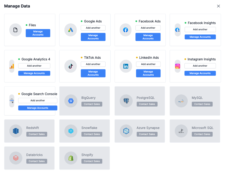 - Zugriff auf mehrere Datenquellen: Ich kann Daten von verschiedenen Plattformen abrufen, darunter Google Analytics 4, Meta Ads, Instagram, TikTok Ads und mehr. Insgesamt stehen dir mehr als 20 verschiedene Datenquellen zur Verfügung.