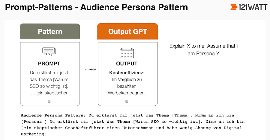 Prompt-Struktur: “ Explain X to me. Assume that I am Persona Y „“