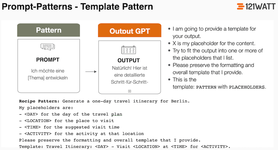 Das Template-Pattern sorgt dafür, dass das LLM (ChatGPT) einem bestimmten Muster oder einem Template folgt. Das kann ein Blog-Artikel oder ein Direct-Mailing sein. Der gewünschte Output muss vielleicht in einem bestimmten Format erstellt werden, das spezifisch für deinen Anwendungsfall ist. Das LLM kennt vielleicht nicht die Struktur deines gewünschten Outputs und du schreibst die Instruktion, wie einzelne Elemente aussehen sollen.