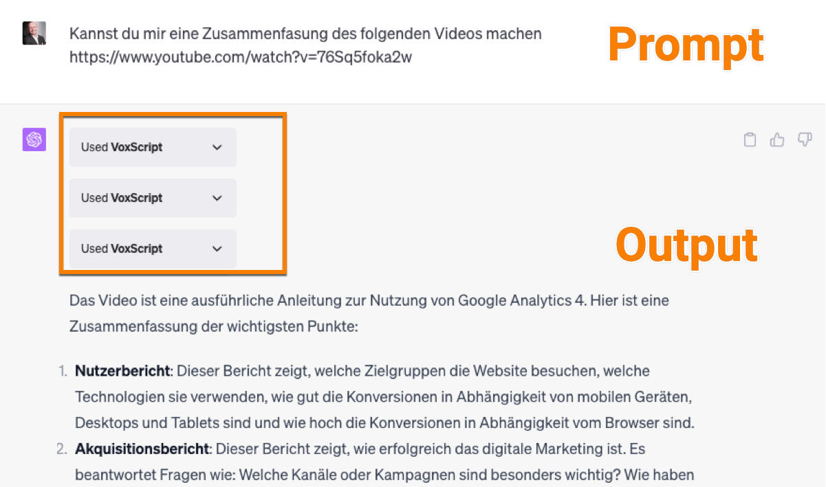 - Youtube-Kanalinformationen zusammenfassen: Mit VoxScript kann man die Ausrichtung eines Youtube Kanals sehr gut analysieren. Hier ein Beispielprompt: “ Ich habe einen Youtube Kanal. Kannst du mir detailliert beschreiben, was das Thema dieses Kanals ist und wie dieser mir helfen kann mehr zu GA4 zu lernen? Hier der Youtube Kanal https://www.youtube.com/@121watt