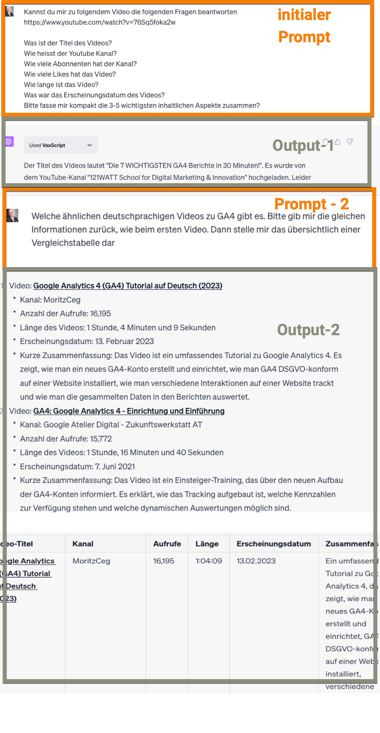 - Prompt 2: Welche ähnlichen deutschsprachigen Videos zu [Thema ]gibt es? Bitte gib mir die gleichen Informationen zurück, wie beim ersten Video. Dann stelle mir das übersichtlich in einer Vergleichstabelle dar.