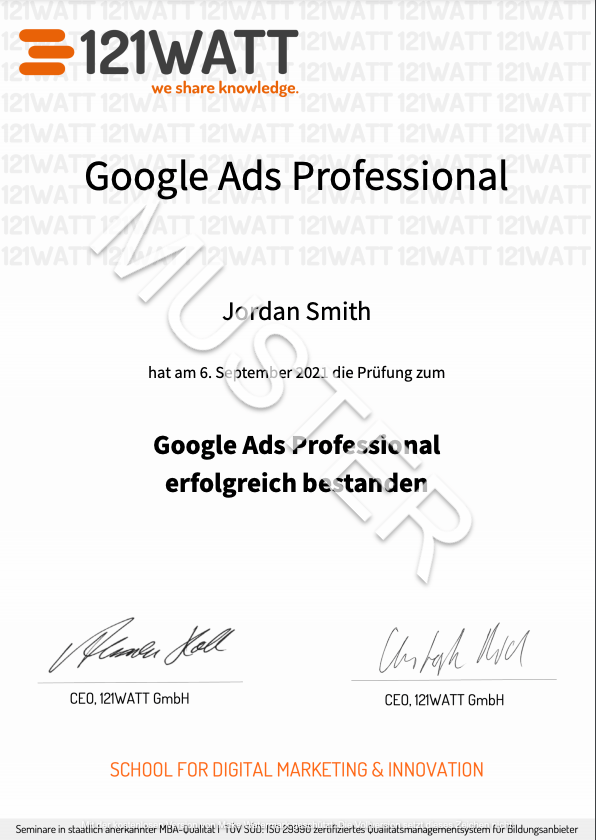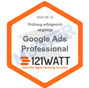Im Anschluss an die bestandene Prüfung erhältst du das 121WATT-Professional-Zertifikat und ein 121WATT-Badge für deine Website oder dein LinkedIn-Profil. Damit kannst du deine Qualifizierung im Bereich Google Ads nachweisen.