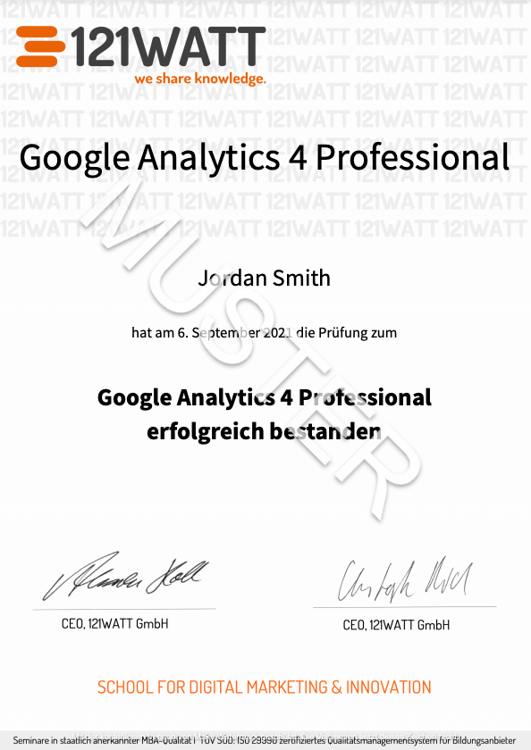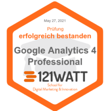 Im Anschluss an die bestandene Prüfung erhältst du das 121WATT-Professional-Zertifikat und ein 121WATT-Badge für deine Website oder dein LinkedIn-Profil. Damit kannst du deine Qualifizierung im Bereich Google Analytics 4 (GA4) nachweisen.