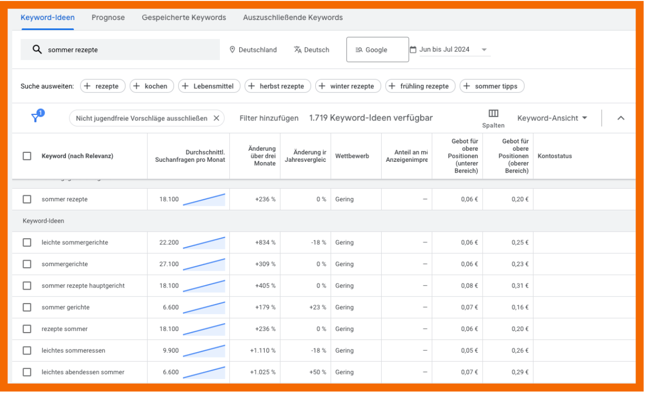 Hier siehst du eine Beispiel-Recherche im Google Keyword Planner zum Thema “Sommer Rezepte”. Neben den durchschnittlichen Suchanfragen pro Monat siehst du auch, dass diese saisonal über die letzten drei Monate stark angestiegen sind. Außerdem bekommst du weitere Keyword-Ideen angezeigt, die du strategisch im Titel, den Überschriften bzw. Unterüberschriften und natürlich im Haupttext platzieren und thematisch behandeln kannst.
