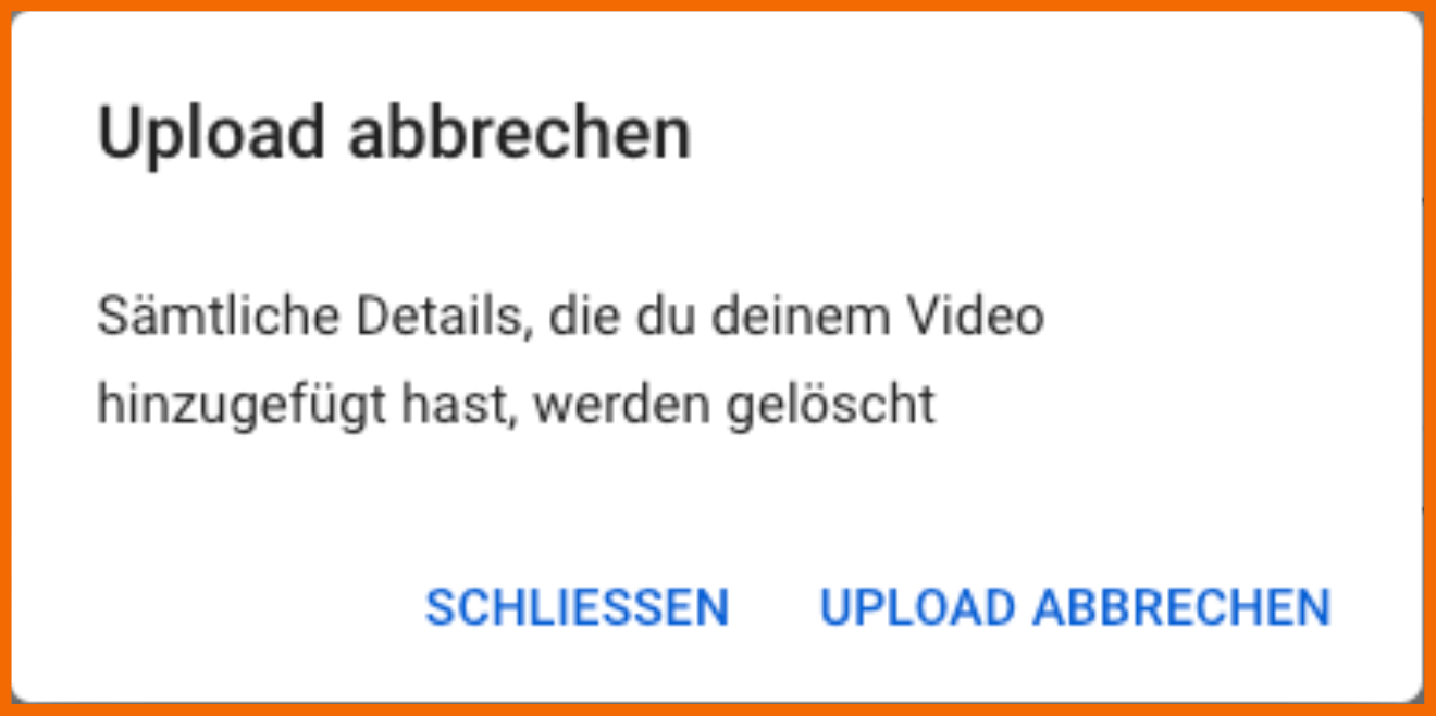 • Eine Warnung, wenn ein User bzw eine Userin eine Aktion durchführen möchte, die sie oder er nicht mehr rückgängig machen kann wie z.B. ein Abbruch eines Uploads bei YouTube: