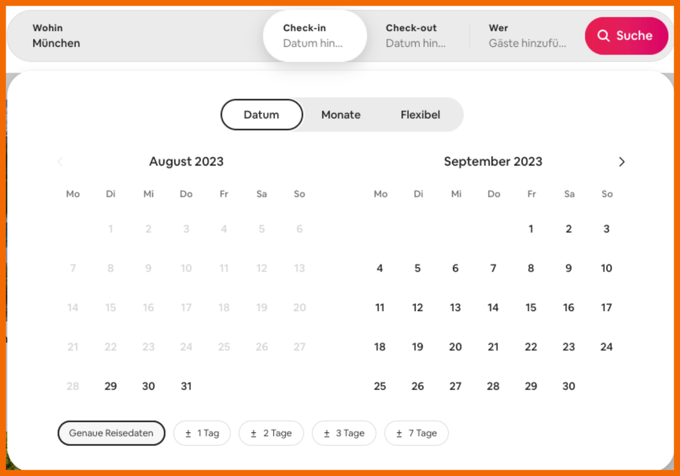 Auf Flugbuchungswebsites bspw. macht der Kunde oder die Kundin oft den Fehler, das Rückreisedatum vor dem Abreisedatum auszuwählen. Um die Benutzerfreundlichkeit zu erhöhen, kann eine Einschränkung in den Kalender eingefügt werden, die verhindert, dass die Benutzer:innen einen falschen Datumsbereich auswählen.
