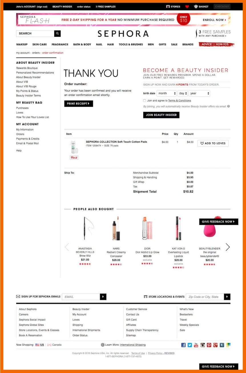 Zusätzlich zum typischen “Danke für Ihren Einkauf”-Inhalt und den nun folgenden Prozessschritten, integriert Sephora hier weitere Elemente in ihre Danke-Seite. Sie verwenden Kaufdaten zur Personalisierung, indem sie beispielsweise die Rubrik “Das haben Kunden noch gekauft” anzeigen. Gleichzeitig wird zur Anmeldung zum Treueprogramm geworben, indem die mit dem Kauf gesammelten Treuepunkte direkt angezeigt werden. Auch die Seitennavigation enthält personalisierte Inhalte und Empfehlungen, die für eine weitere Interaktion mit der Webseite sorgen sollen.