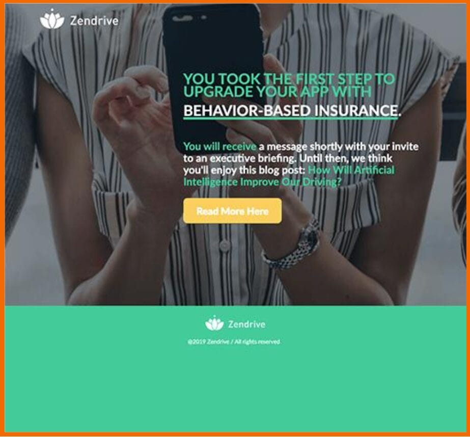 Zendrive kommuniziert auf ihrer Danke-Seite im Beispiel klar und deutlich, dass der Kunde bzw. die Kundin den ersten Schritt erfolgreich abgeschlossen hat. Gleichzeitig findet eine Vorteilskommunikation statt, die nochmals verdeutlicht, welchen Mehrwert der Kunde bzw. die Kundin damit für sich selbst generiert hat. Es wird klar beschrieben, was als nächstes passiert und womit der Kunde bzw. die Kundin nun rechnen kann und wann. Zuletzt wird die erhöhte Aufmerksamkeit in dieser letzten Phase des Kaufprozesses genutzt, um über die Bereitstellung eines Links auf einen thematisch passenden Inhalt auf ihrem Blog zu verweisen. Dadurch kann das Vertrauen weiter gestärkt werden, noch bevor das Briefing beginnt.