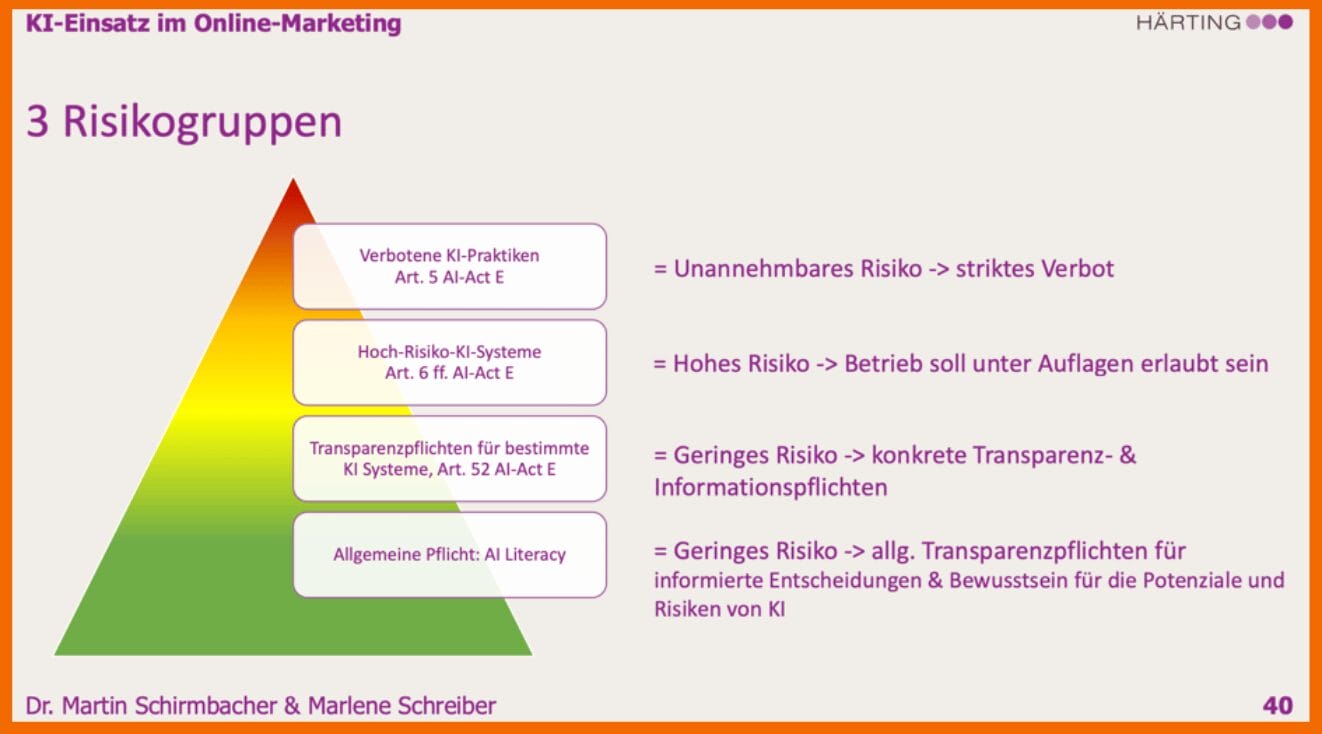 Der AI Act teilt künstliche Intelligenz in drei Risikostufen (unannehmbar, hoch und gering) ein. Unser Experte Martin zeigt dir die Einteilung auf der folgenden Grafik: