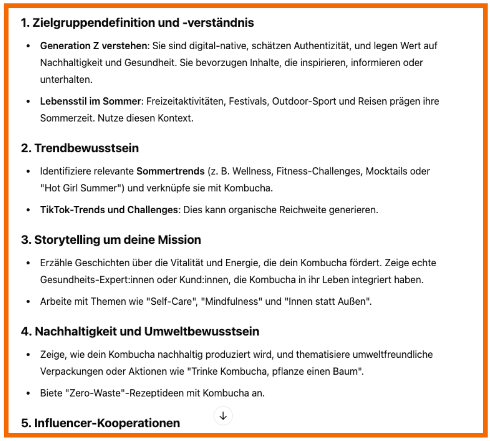 „Ich habe eine Kombucha-Marke. [Markendetails] Ich versuche, die Generation Z zu erreichen. Ich möchte eine Social-Media-Kampagne rund um den Sommer und Kombucha machen. Gib mir zehn strategische Rahmenbedingungen geben, die mir helfen, die Herausforderung zu verstehen und kreative Wege zu finden, um sie anzugehen.“