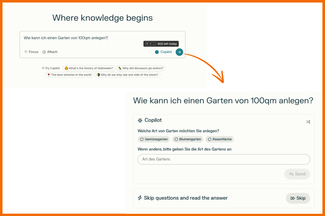 Nehmen wir an, du möchtest einen Garten anlegen und wendest dich an Perplexity AI Copilot um Hilfe. Zunächst würde Copilot Fragen zu deinen Präferenzen stellen, wie zum Beispiel welche Art von Garten du dir vorgestellt hast (Gemüsegarten, Blumengarten, Rasenfläche), im weiteren Schritt welche Art von Blumen du bevorzugst und was dein Budget ist. Auf Basis dieser Parameter durchsucht Copilot dann das Internet und liefert eine Antwort, die diese Aspekte abdeckt. Wenn du nichts Konkretes eingeben möchtest, kannst du die weiteren Fragen überspringen.