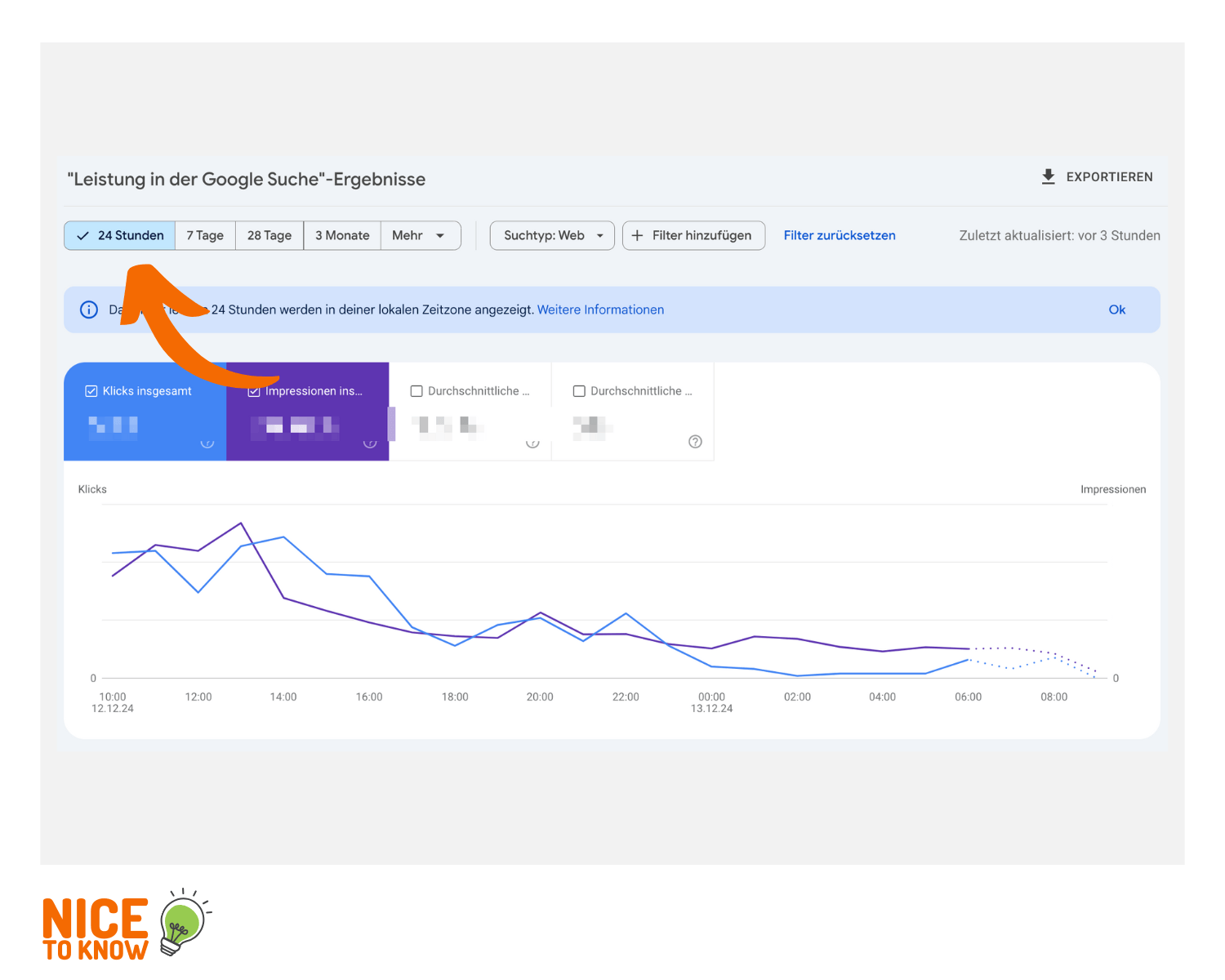 In der Google Search Console hast du jetzt die Möglichkeit, Daten im Zeitrahmen von 24 Stunden zu analysieren. Diese Funktion ist besonders interessant, wenn du entweder neue Inhalte veröffentlichst und sie zu Beginn engmaschig monitoren willst, oder wenn du wissen willst, wie sich die SEO-Performance deiner Seiten im Laufe eines Tages verändert.