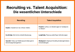 Während Recruiting meist reaktiv ist – „Wir haben eine Stelle zu besetzen, lass uns jemanden finden“ – verfolgt TA einen proaktiven Ansatz. Es geht um nachhaltige Talentpools, datenbasierte Entscheidungen und den Aufbau echter Beziehungen. TA bedeutet, Talente nicht nur für offene Stellen zu gewinnen, sondern sie langfristig an das Unternehmen zu binden. Wusstest du, dass Unternehmen mit TA-Strategien durchschnittlich 40 % schneller qualifizierte Fachkräfte finden?