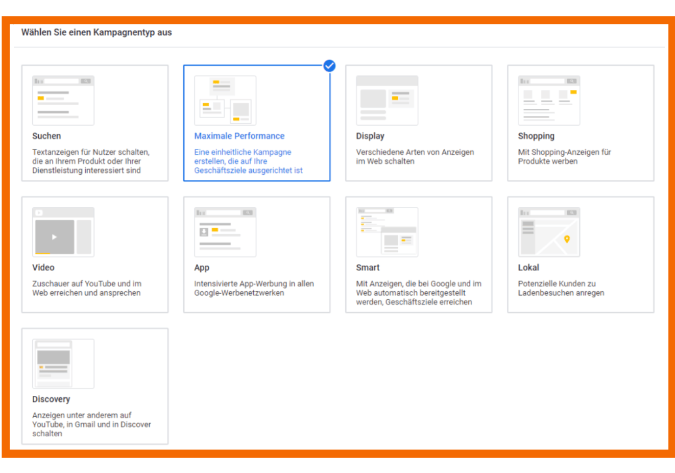 - Wähle als Kampagnentyp „Maximale Performance“ aus und lege das gewünschte Conversion-Ziel fest.