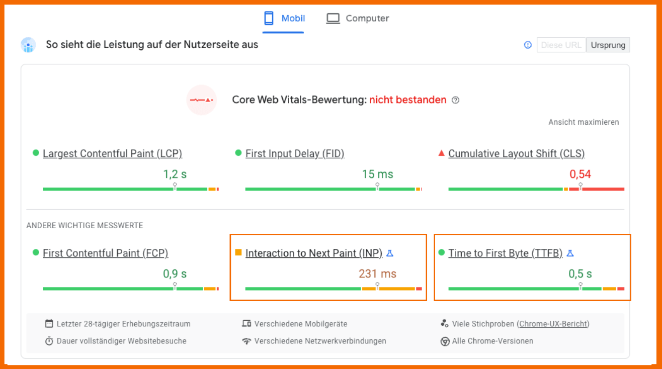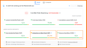 Wenn du aktuell einen Page Speed Test machst, siehst du eine weitere neue Metrik: Time to First Byte (TTFB). Diese grundlegende Kennzahl gibt dir Aufschluss über die Verbindungsaufbauzeit und die Reaktionsfähigkeit von Webservern. Sie hilft dir zu erkennen, ob dein Webserver zu langsam auf Anfragen reagiert. Das Chrome-Web-Dev-Team stellt aber klar, dass diese Metrik aktuell kein Bestandteil der Core Web Vitals ist, dieser Wert also nicht in deinen Score hineinfließt.
