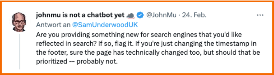 Das Lastmod-Tag (last modification) in der Sitemap zeigt an, wann eine URL das letzte Mal geändert worden ist. Das möchte Bing stärker für sein Crawling nutzen und auch Google hat ein Statement dazu: Setze das Lastmod-Attribut immer dann, wenn es sinnvoll ist.