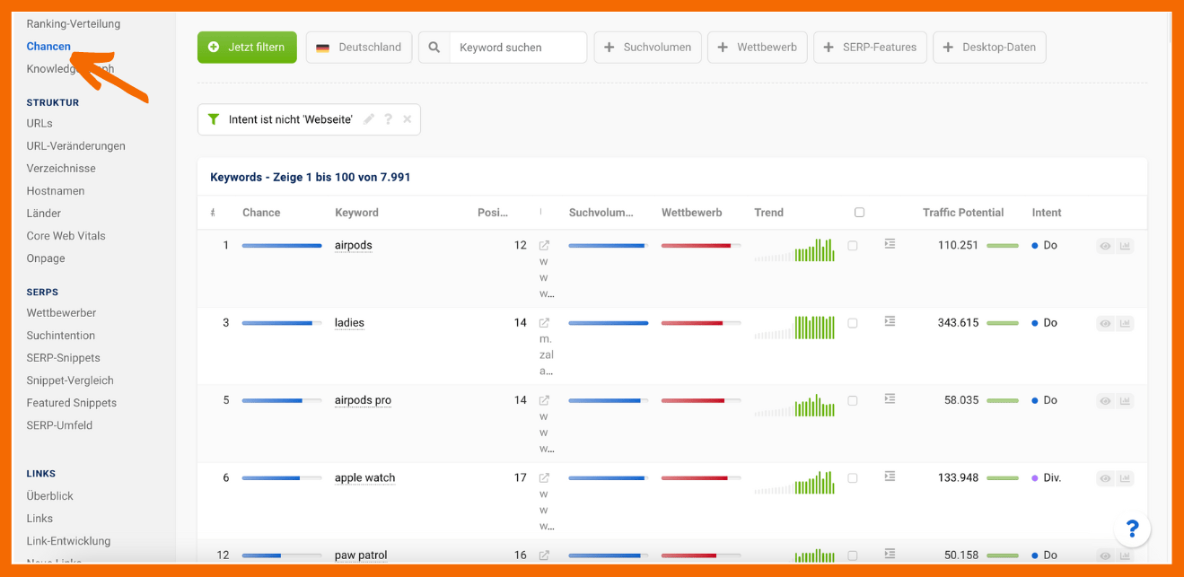 Im Bericht Chancen legst du den entsprechenden Filter Position 11-20 an. Hier siehst du zwar auf den ersten Blick die Rankings deiner Konkurrenz nicht, dafür aber andere Kennzahlen von Sistrix wie das Traffic Potential. - Sowohl in Semrush als auch in Sistrix kannst du weitere Filter setzen wie z. B. den Filter Suchintention: Transaktionsorientiert / Intent: Go. Verwende diese, um die Keywords zu identifizieren, die mit geringem Aufwand das größte Umsatz-Potential bieten. Außerdem kannst du nach Suchvolumen sortieren, um dein größtes Traffic-Potential zu finden. Im Bericht Chancen von Sistrix kannst du sogar direkt nach dem Potential filtern.