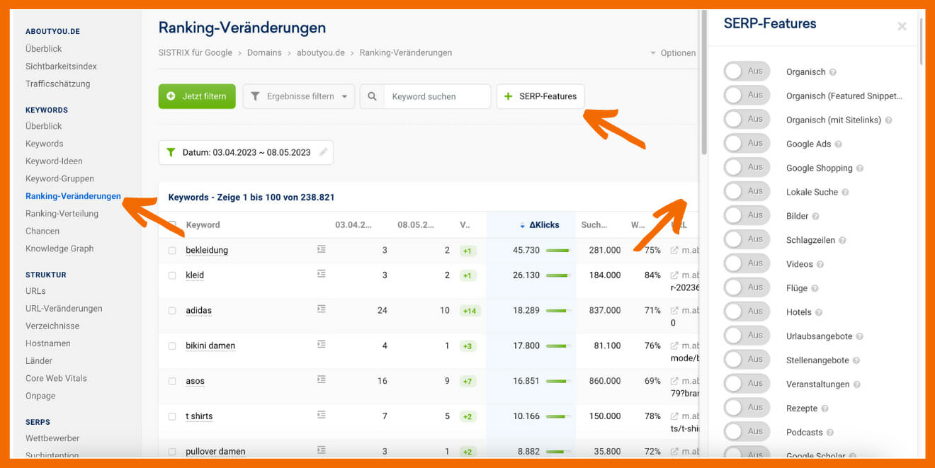 In Sistrix gehst du ähnlich vor und klickst in der Liste auf die Domain, die du analysieren willst oder gibst diese oben in die Suche ein. Anschließend gehst du links unter Keywords auf Ranking-Veränderungen. In der Tabelle findest du die Keywords, zu denen es zum angegebenen Zeitraum Keywordveränderungen gab. Diesen kannst du unter Datum einfach ändern. Auch hier kannst du die Tabelle wieder nach Ergebnissen filtern, die dich besonders interessieren. In Ergebnisse filtern kannst du beispielsweise nach verbesserten Rankings der Keywords in den Top 10 Positionen suchen. Wenn du auf den Bericht Serp-Features gehst, kannst du in Sistrix sogar aus einer Liste bestimmte Features auswählen, nach denen du filtern möchtest.