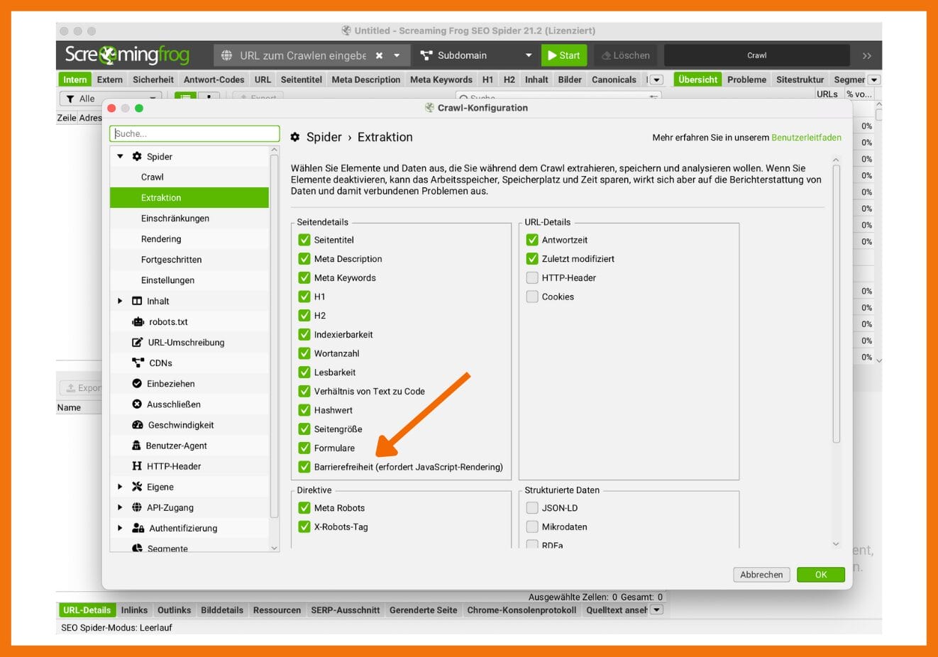 Ziel ist es, deine Website inklusiver zu gestalten und die User Experience für Menschen mit Behinderungen deutlich zu verbessern, beispielsweise durch alt-Texte, Kontraste oder Anpassbarkeit der Bildschirmgröße. Um die Barrierefreiheit der Seiten zu analysieren, musst du sie unter Konfiguration > Spider > Extraktion als neues Register hinzuzufügen.