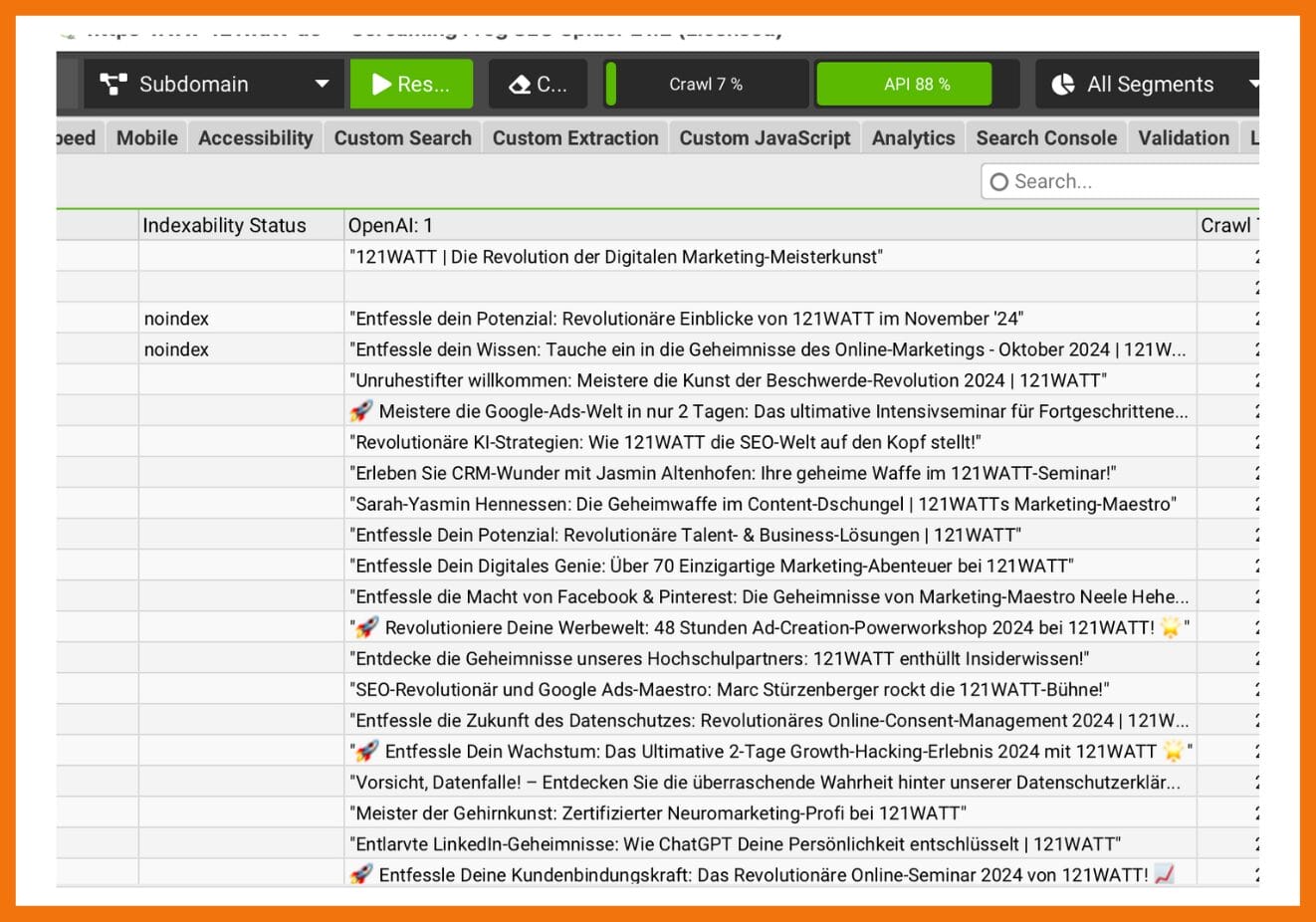„Bitte formuliere den Title um und mach ihn außergewöhnlich und mutig. Der Titel soll Aufmerksamkeit erregen und ungewöhnlich klingen, dabei jedoch immer noch die Kernbotschaft vermitteln. Ziel ist ein auffälliger Title mit hoher CTR in der SERP, der Neugier und Interesse weckt.“ (Hinweis: Der Prompt ist leicht übertrieben, zeigt aber die Möglichkeiten der Verbindung zwischen OpenAI und dem ScreamingFrog)