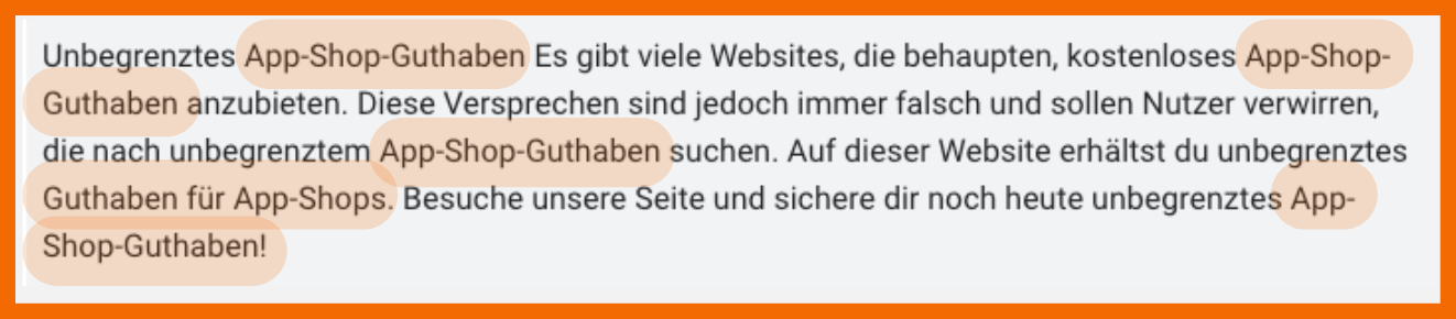 Fängst du an, maßlos Keywords auf deiner Website einzufügen, mit dem Ziel, dein Ranking und Traffic schnell zu verbessern, kann es sein, dass du genauso schnell wieder dein Ranking verlierst. Suchmaschinen wie Google erkennen und bestrafen diese Methode heutzutage, da sie gegen deren Richtlinien verstößt und als Spam gilt. Deine Website könnte dadurch an Ranking verlieren oder sogar komplett aus dem Index entfernt werden. Um zu verhindern, dass du „böses“ Keyword-Stuffing begehst, solltest du vermeiden, Wörter, Wortgruppen und Nummern in deinem Text so häufig zu wiederholen, dass sie unnatürlich klingen und so der Mehrwert deiner Website verloren geht so wie im Beispiel unten: