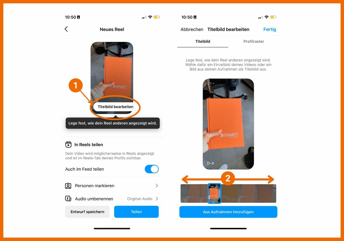 Das Cover-Foto deines Reels ist das Bild, welches User:innen als Vorschau für dein Reel im Profil-Feed angezeigt wird. Wähle einen passenden Ausschnitt aus, um User:innen neugierig zu machen. Das geschieht im letzten Schritt des Bearbeitungsprozesses, wo du auch die Caption eintippst. Klicke in der Ansicht auf Titelbild bearbeiten und wähle den Ausschnitt, den du in deinem Feed angezeigt haben möchtest.