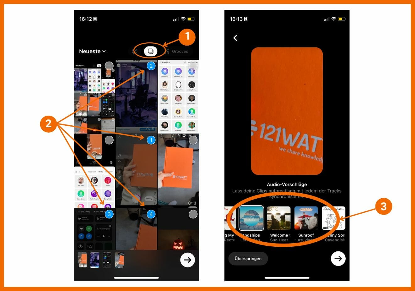 Instagram hat eine Funktion, bei der deine Videos automatisch an den Beat eines Songs angepasst werden. Das spart dir zeit, da du die Videos so nicht selber auf die richtige Länge zusammenschneiden musst (ähnlich wie bei der Vorlagen-Funktion). Wähle dazu im Aufnahme-Modus mehrere Videos gleichzeitig aus und füge sie zu deinem Video hinzu. Anschließend wählst du einen der vorgeschlagenen Sounds aus oder suchst nach einem spezifischen Song, den du verwenden willst. Klicke auf den Weiter-Pfeil und schon synchronisiert Instagram die Videos passend zum Beat des Sounds. Anschließend kannst du über den Reiter Clips bearbeiten noch die spezifischen Stellen der einzelnen Clips auswählen, die im Video auftauchen sollen.