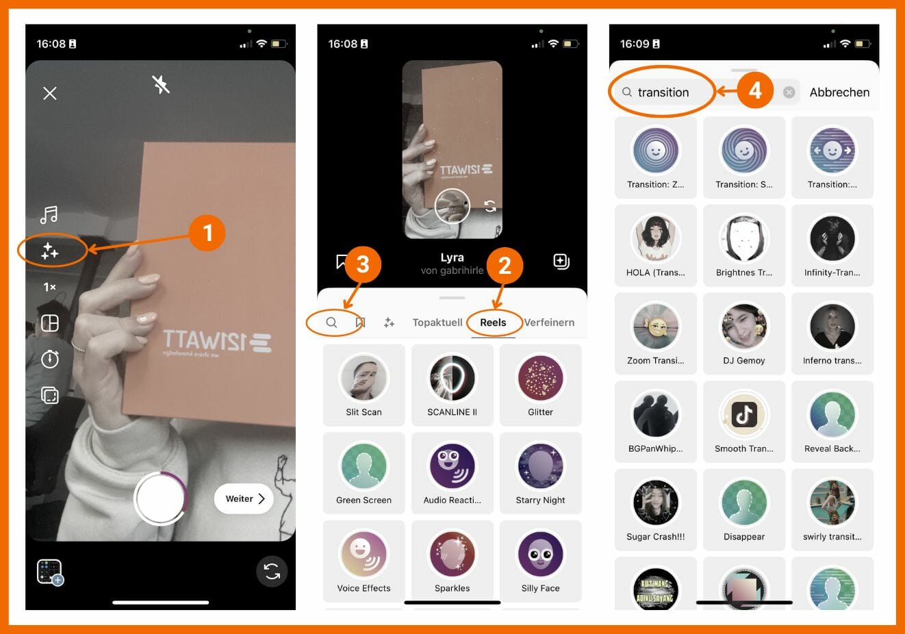 Auch für sogenannte Transitions, also Übergänge zwischen den einzelnen Clips in deinem Video, hat Instagram einige Möglichkeiten zur Auswahl. Um die Transitions zu entdecken, klickst du im Aufnahme-Modus auf das Effekte-Icon (die drei kleinen Sternchen) und wählst dort den Reiter Reels aus. Suche dort nach den Transition Effekten. Hast du den passenden gefunden, wählst du ihn aus und folgst den Instruktionen, um dein Video aufzunehmen. Diese Funktionen kannst du leider nicht auf bereits gedrehte Videos anwenden.