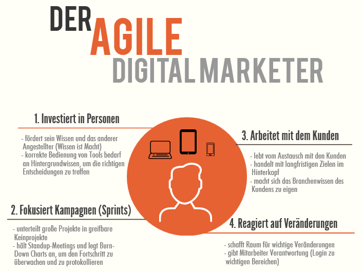 Als große Sparte des Marketings kann auch das Digital-Marketing von den Vorteilen der Agilen Methode profitieren – wahrscheinlich mehr als das klassische Marketing selbst. Grund dafür ist die rapide Veränderung im Online-Marketing, die ein schnelles Handeln erfordert. Mehrere kleine Unterprojekte bringen hier eindeutig mehr als das Ausarbeiten eines umfangreichen Online-Marketing-Plans. Denn wenn du mit der Umsetzung dieses Plans beginnen möchtest, ist er wahrscheinlich schon nicht mehr auf dem aktuellen Stand.