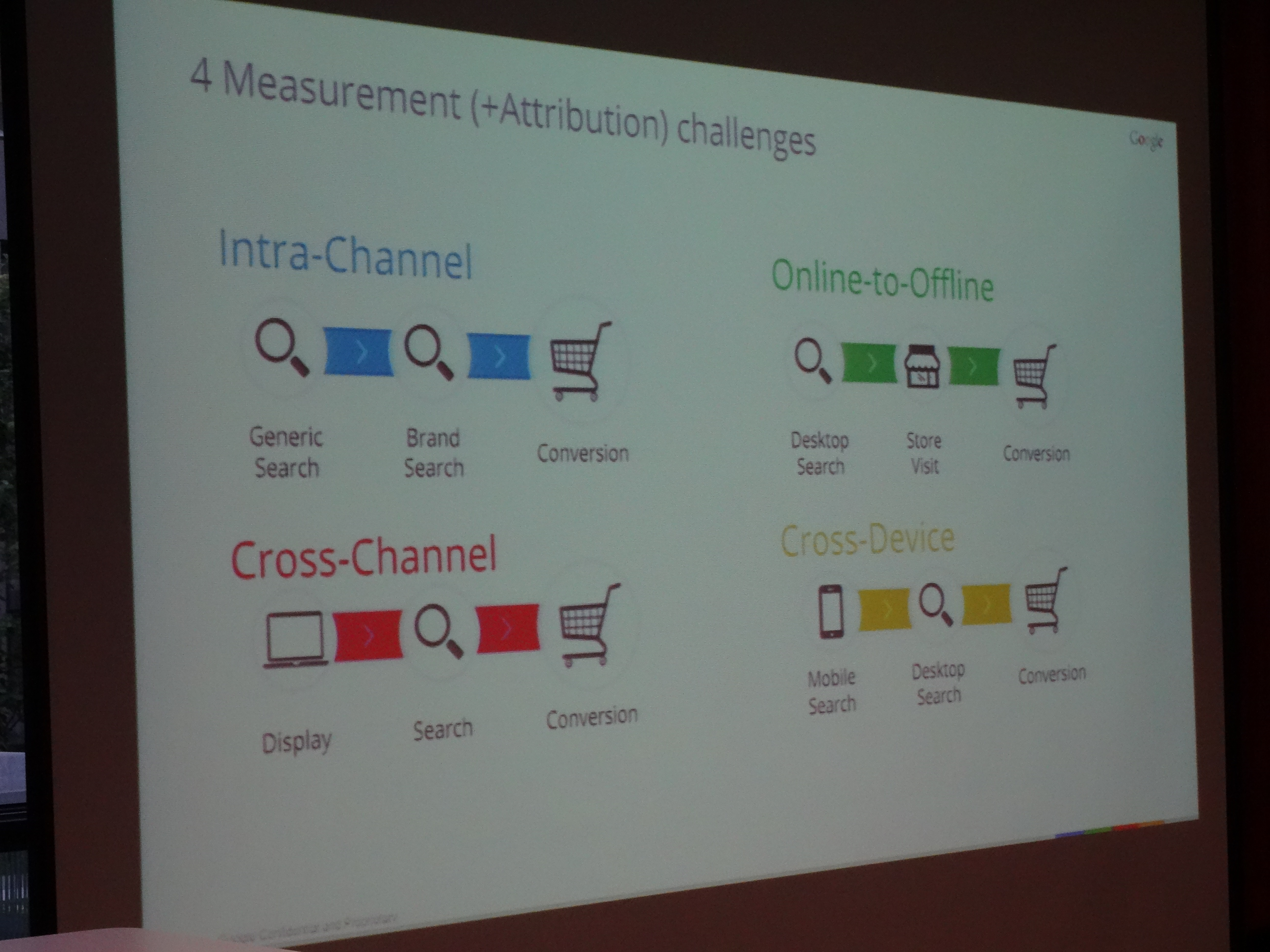 Auf Grund dieser Slides ist es einleuchtend, dass wir ein optimiertes Attribution Modell nutzen sollten. Doch die Realität sieht meistens noch anders aus. Nur wenige Unternehmen stellen sich der Herausforderung. Hauptgrund dafür ist laut Matthias Cada das fehlende Wissen ein solches Attributionsmodell umzusetzen. Die größte Herausforderung sieht er beim Zuordnen von Wertigkeiten für einen Kanal, wenn der Weg hin zur Conversion sehr verschachtelt ist. Dies ist der Fall bei Intra-Channel, Online-to-Offline, Cross-Channel oder Cross-Device Suchen, die eine eindeutige Zuordnung erschweren.