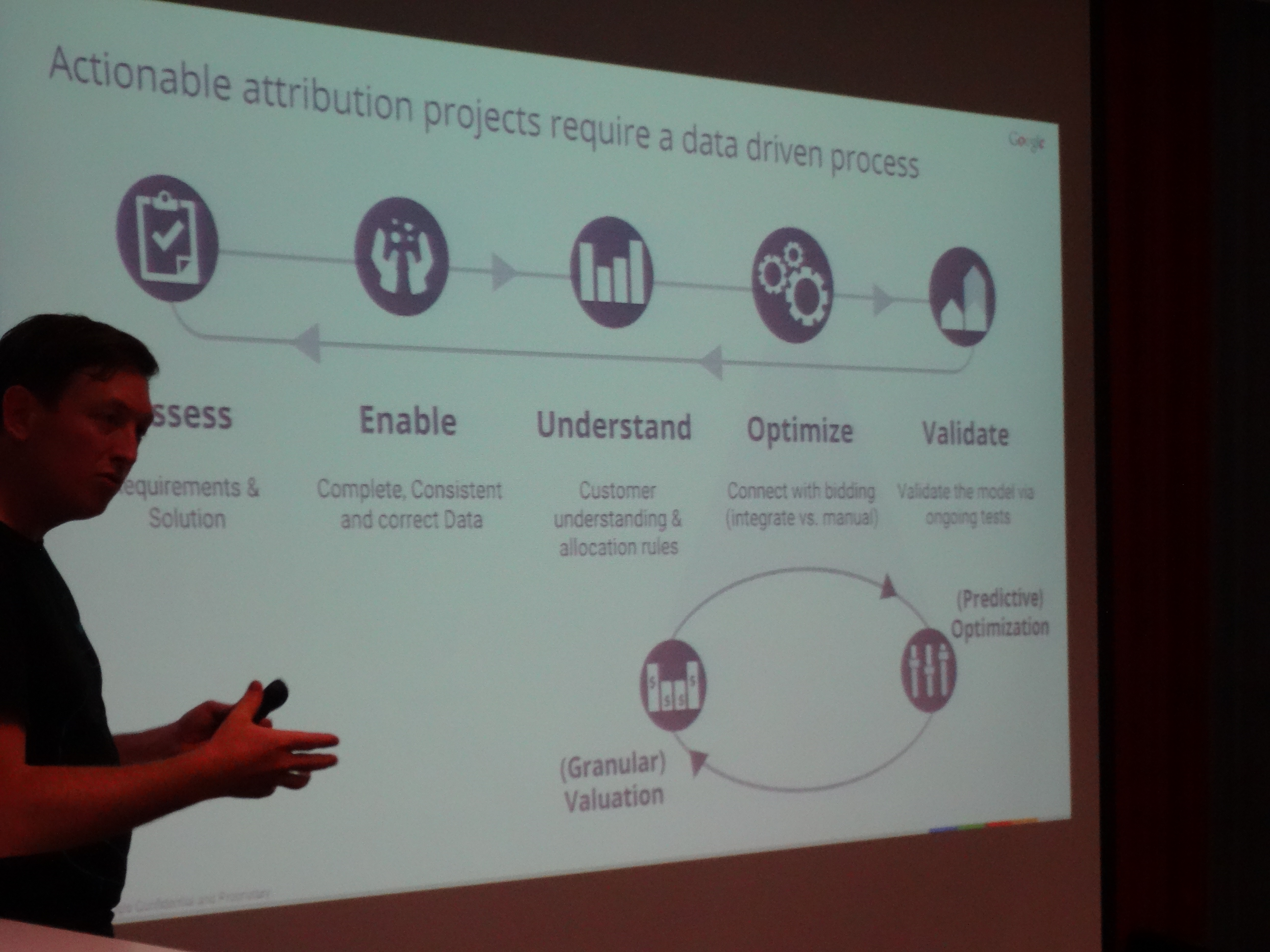 Getreu dem Motto: das Beste kommt zum Schluss, hielt unser „special guest“ Matthias Cada von Google den abschließenden Vortrag. Er erklärte uns die Wichtigkeit von „Attribution“. Doch was ist Attribution genau, magst auch Du Dich fragen? Durch Attribution kann man einem jeden Marketingkanal einen bestimmten Wert zuweisen. Dieser Wert spiegelt im Idealfall die Relevanz und Wichtigkeit dieses Kanals bei der Generierung von Conversions wieder. Google feilt diesen Prozess der Wert-Zuweisung momentan immer weiter aus, um eine bessere Grundlage für Budgetentscheidungen im Marketing zu schaffen. Wenn Du weißt, wie viel ein jeder Kanal (TV, AdWords, Facebook, etc.) genau zu einer Conversion beiträgt, dann kannst Du viel effektiver auf Anzeigenplätze bieten. Um dies genauer darzustellen hatte Matthias Cada den Vergleich zwischen einem einfacheren und fortgeschrittenen Attribution Model mitgebracht. Im zweiten Fall siehst Du, dass die Attribution granularer gemessen wurde und somit eine ganz andere Budgetforderung zuließ: