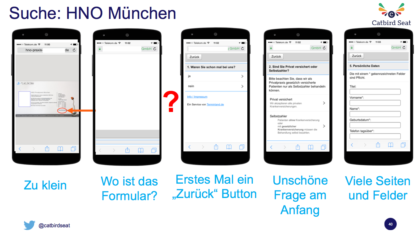 Matthias Weth hatte viele gute Beispiele mit im Gepäck, wie man mobile Nutzer nicht durch seine Website führen sollte. Eines dieser Beispiele möchte ich Dir hier vorstellen: Die HNO Website. Hier warb ein Arzt für seine HNO Praxis. Im unten stehenden Screenshot siehst Du, dass die Website nicht mobil optimiert und die Darstellung somit viel zu winzig für den kleinen Bildschirm war. Wenn man dann den Button zur Terminreservierung gefunden hatte, kam man auf eine blanke Seite. Per Zufall erreichte Matthias Weth durch einen Klick auf einen unteren grauen Balken die eigentliche Anmeldeseite. Dort gab es dann zum ersten Mal einen „zurück“ Button, der vorher schon dringend nötig gewesen wäre. Im zweiten Schritt der Anmeldung musste man dann angeben, ob man Kassenpatient (und somit Selbstzahler) oder privat versichert ist – was für eine unschöne Frage. Kassenpatienten werden direkt vor den Kopf gestoßen. Nach zwei weiteren Formularfeldern, die das Datum und die Uhrzeit abfragten und hier nicht gezeigt werden, kam dann noch ein fünfter Schritt. Man sollte persönliche Daten eingeben. Alles in allem wird diese Website nicht erfolgreich in der Generierung von neuen Patienten sein. Der Prozess der Anmeldung ist umständlich und lang. Der Nutzer weiß zum Teil gar nicht, wo er klicken soll und wie er sein Ziel, die Reservierung des Termins, schnell erreichen kann. So solltest Du es besser nicht machen. Aber wie dann?