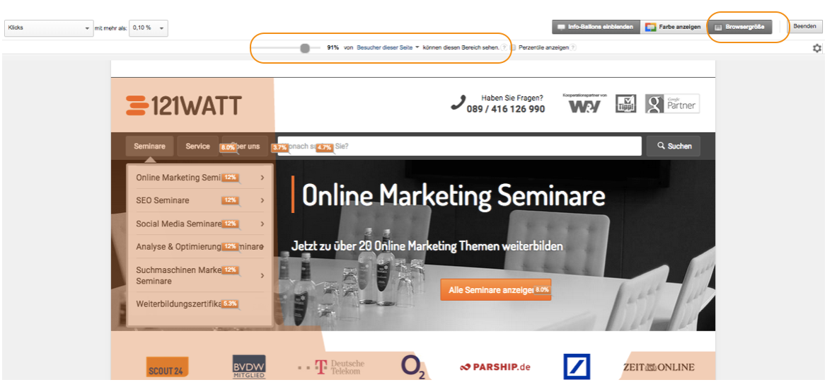 Eine spannende Analysemöglichkeit bietet Dir die InPage Analyse. Hier erfährst Du, wie Nutzer die Website sehen, welche Bereiche dabei im Fokus liegen und am häufigsten angeklickt werden und welche Bereiche wiederum mobil verborgen bleiben. Mit Hilfe der InPage Analyse kann man jede Seite einzeln anschauen und Rückschlüsse auf das Verhalten der Konsumenten ziehen.