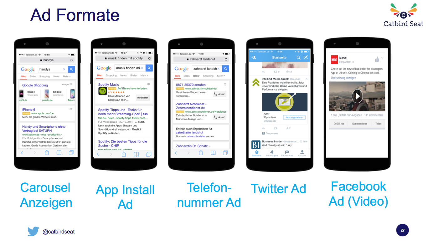 Um dabei erfolgreich zu sein, muss der Vermarkter die mobile Darstellung sowie die mobilen Kanäle beachten. So sind neue Werbeformate wie Carousel Ads, App install Ads, Call-Only Ads, Facebook Ads, Twitter Ads und auch die Beacons entstanden. Vermarkter müssen genau wissen, was sie mit ihrer Werbung erreichen wollen. Ist dies z.B. ein Klick auf einen Link, das Anschauen eines Videos, die Interaktion mit Seitenbeiträgen oder der Aufruf einer Website? Je nach dem muss die grafische Darstellung angepasst und ein call-to-action Buttons implementiert werden.
