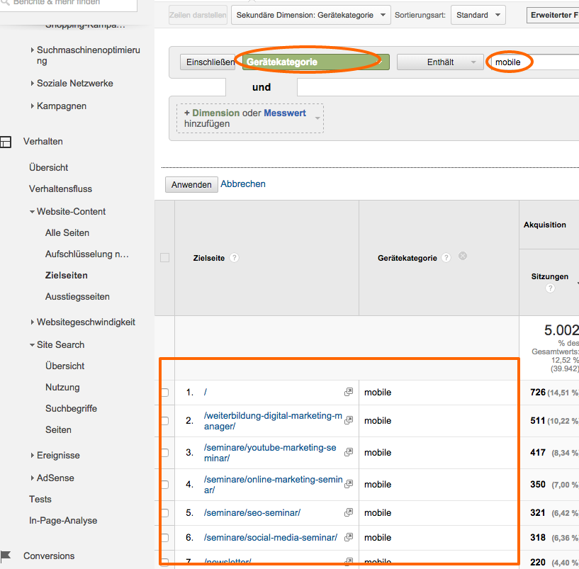 Gehen wir nun weiter zu dem zweiten besprochenen Bereich, dem Verhalten Deiner mobilen Nutzer. Wenn Du nun weißt, wonach Deine User suchen, ist es interessant, auf welchen Landingpages sie bei Dir ankommen. An dieser Stelle macht es Sinn sich anzuschauen, ob Deine Landingpages zu den Suchanfragen passen und ob sie inhaltlich liefern, wonach Dein Kunde sucht. Schaue Dir hier unter Verhalten -> Zielseiten mit der Einstellung Gerätekategorie / mobile Deine am häufigsten aufgerufenen Zielseiten an. Wie ist es z.B. um die Absprungrate bestellt? Solltest Du Seiten mit hoher Absprungrate mobil optimieren?