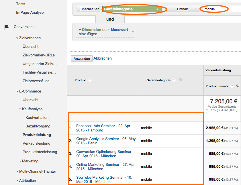 Als letztes sprach Alexander über mobile Transaktionen und Conversions. Wenn Du einen Onlineshop besitzt, interessiert Dich sicher auch, wie viele Kunden mobil eine Transaktion abschließen und was sie genau kaufen (welche Produkte). Um einen Bericht darüber aufzurufen, musst Du Dich in den Bereich E-Commerce bei Google Analytics begeben und mithilfe der sekundären Dimension nach „Gerätekategorie“ filtern.