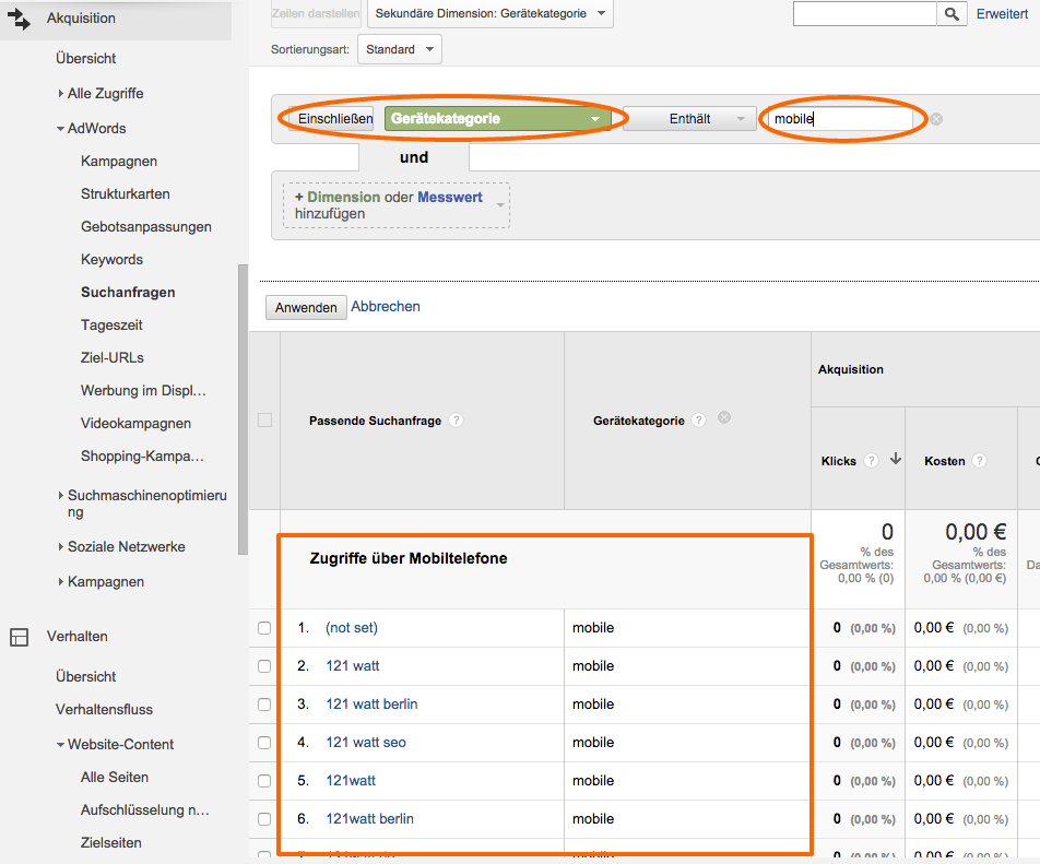 Nachdem Du mehr über die demographischen Merkmale Deiner Nutzer weißt, fragst Du Dich bestimmt: wonach suchen diese denn? – Eine berechtigte Frage. Antwort darauf findest Du unter Akquisition -> AdWords -> Suchanfragen, wenn Du diese nach der Gerätekategorie „mobile“ filterst (siehe Screenshot unten). Dies kann Dir Deine Frage beantworten, ob Du auf bestimmte Keywords mobil optimieren solltest.