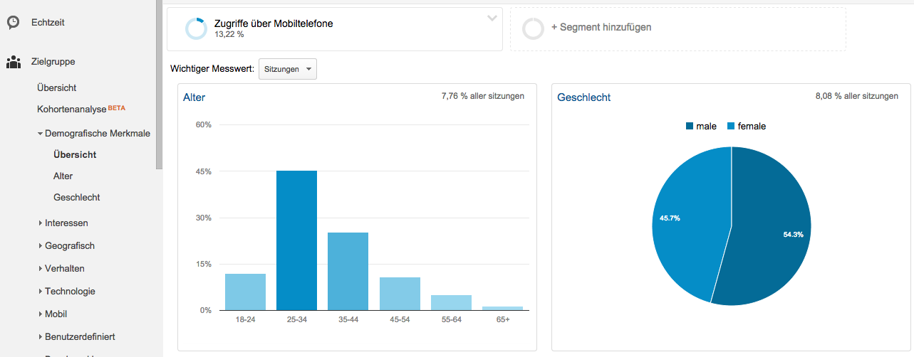 Nun aber zu der Frage, wer Deine Nutzer sind. Welchen Altersgruppen gehören sie an und sind sie männlich oder weiblich? Eine Antwort auf diese Fragen findest Du, wenn Du nach dem Segment „Zugriff über Mobiltelefone“ filterst und Dir die demographischen Merkmale in der Zielgruppen Analyse anzeigen lässt.