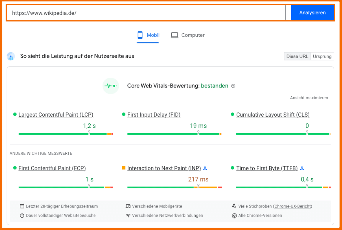 Wenn du den deinen Core Web Vitals Score messen möchtet und wissen willst, ob du bestanden hast , dann siehst du in der GSC echte Nutzerdaten (Felddaten). Diese Daten kommen aus dem Chrome UX-Reports, also von echten Nutzer:innen. Hier findest du ein Google Looker Studio Template für die Messung deiner Feld-Daten über einen längeren Zeitverlauf. Diese Daten siehst du auch in deinen Google Search Console Daten (UX-Bericht für Chrome). Einen umfassenden Einblick in die CrUX-Methode bekommst du bei Google direkt.