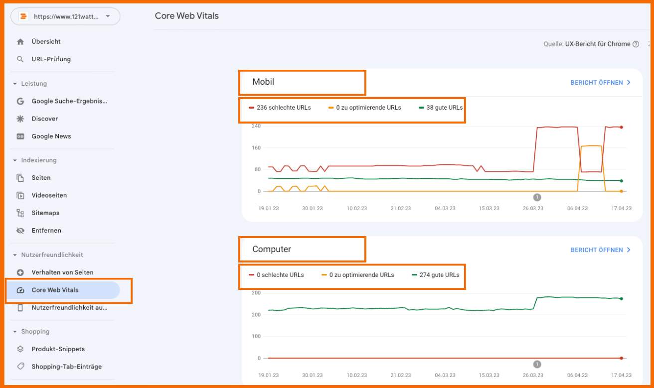 In der GSC findest du im Menüpunkt Nutzerfreundlichkeit -> Core Web Vitals eine Übersicht zu deinen URLs, wo es in Abhängigkeit von der Gerätekategorie (Mobile / Desktop) Probleme gibt. So sieht das zum Beispiel bei uns aus: