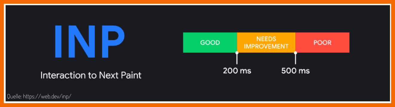 Diese Metrik gibt dir Auskunft über die Reaktionsgeschwindigkeit deiner Webseite über den gesamten Besuch hinweg. Sie ist die jüngste Komponente der Core Web Vitals, weil sie erst seit März 2024 den Messwert FID als Core Web Vital ersetzt. Denn beim First Input Delay geht es nur um die erste Interaktion, während der INP alle Interaktionen eines Seitenbesuchs berücksichtigt.
