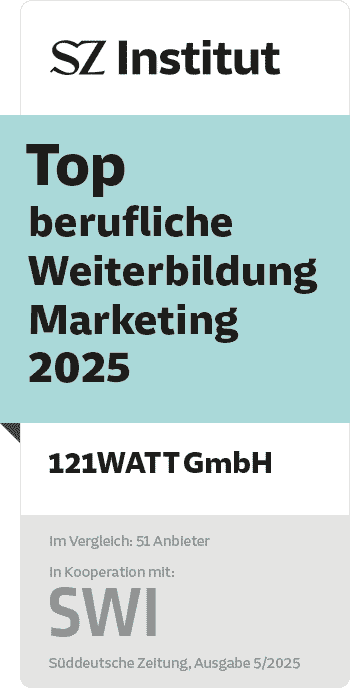 - Auszeichnung SZ-Institut: Die Süddeutsche Zeitung hat uns in der Kategorie „Weiterbildung Marketing“ als Top beruflicher Weiterbildungsanbieter ausgezeichnet. Weitere Informationen zu den Kriterien und der Auszeichnungen findest du hier.